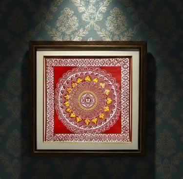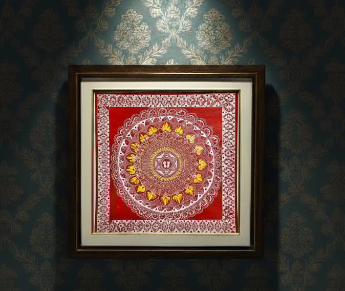 This striking Aipan painting pulses with spiritual energy and sacred geometry, brought to life on a traditional crimson canvas. At its heart lies a powerful yantra motif, an auspicious symbol of protection and cosmic balance, surrounded by rhythmic bands of intricate hand-drawn patterns. The radiant flourishes in yellow evoke the eternal flame, symbolizing prosperity, transformation, and the enduring light of the Himalayas. Each detail in this piece is rendered with remarkable precision, reflecting days of deep immersion and respect for age-old ritual. The symmetrical borders and vibrant hues echo mountain festivities, temple ceremonies, and the timeless cycles of nature celebrated by the region’s artisan communities. This painting is more than a decorative work, it is a portal to the sacred heart of the Himalayas. Born from devotion and tradition, it invites you to bring the blessings of harmony, energy, and spiritual continuity into your space, carrying forward the luminescent heritage of Uttarakhand.