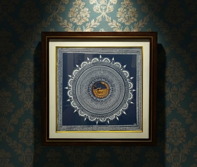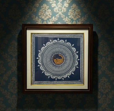 This exquisite Aipan painting reimagines tradition as a meditative embrace of blue, a hue chosen by the artist to evoke the serene spirit of the Himalayas while honoring sacred folk rituals. At the heart rests a Nath, an intricate nose ornament, symbolizing marital grace, cultural pride, and the auspicious blessings bestowed by generations of mountain women. Creating this masterpiece is a feat of devotion, requiring up to 72 hours of patient, precise artistry. The concentric hand-drawn motifs radiate protection and prosperity, each brushstroke echoing time-honored customs and the subtle resilience of its maker. With every detail, this painting carries not just heritage but the personal story and spirit of the artisan: a testament to endurance, beauty, and sacred craftsmanship meant to inspire and illuminate any space it enters.