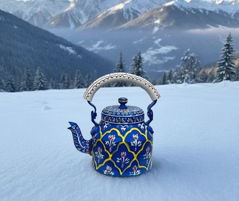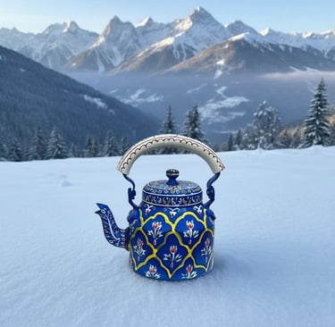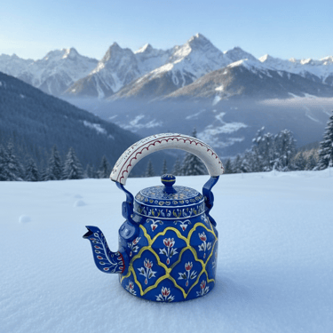 Discover a treasure from the heart of India with the Royal Rhapsody: Indigo Tulip Palace Kettle. Bold, scalloped patterns reminiscent of majestic palace arches dance around bright tulip motifs, all set against an opulent indigo base. A handpainted white handle with festive accents crowns this distinctive kettle, like a page from a Mughal miniature. This piece is a celebration of meticulous skill, patience, and cultural splendor, bringing history and beauty straight to your table. Crafted to inspire conversations, each kettle is a vivid tribute to Indian artisans and the timeless art they preserve.